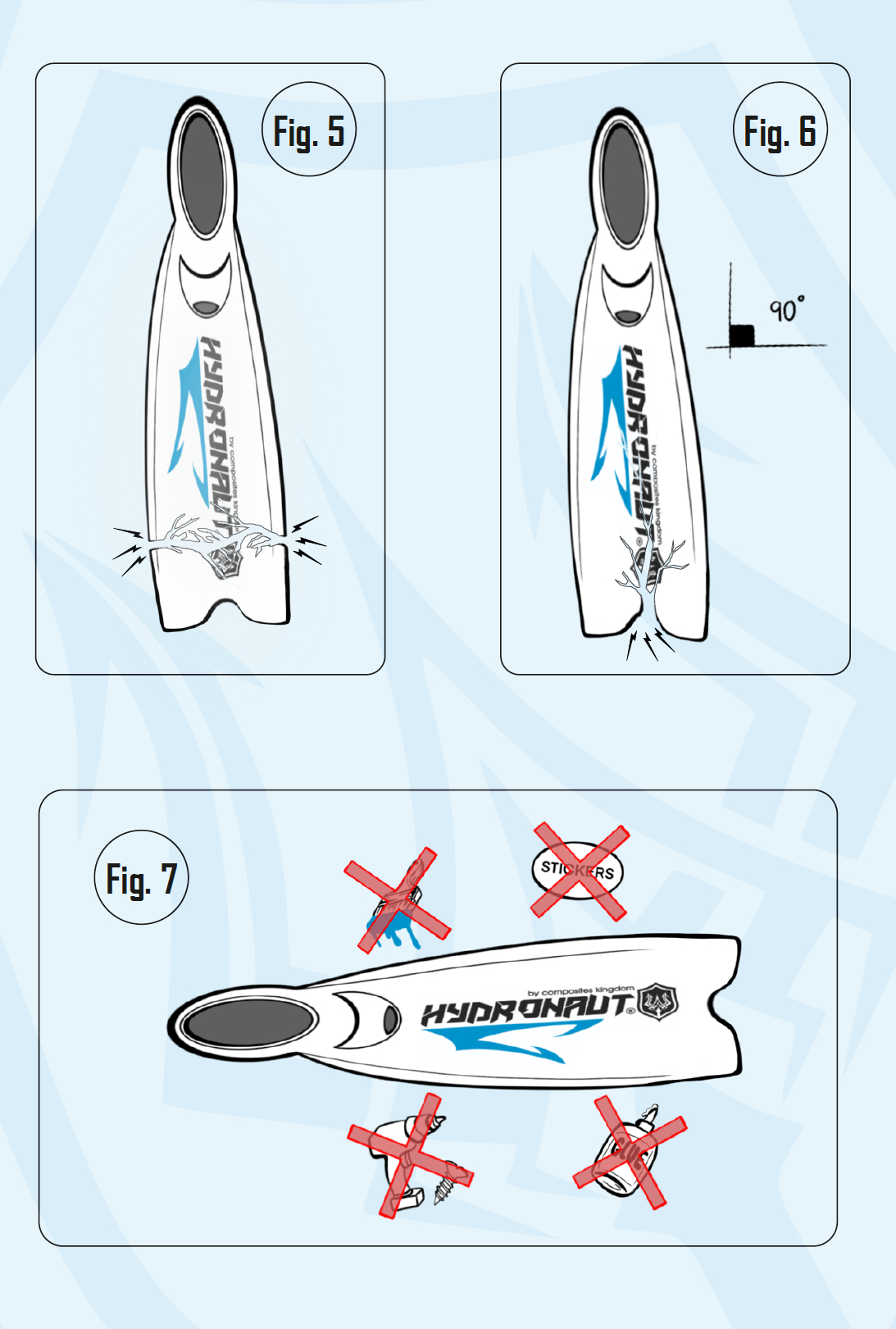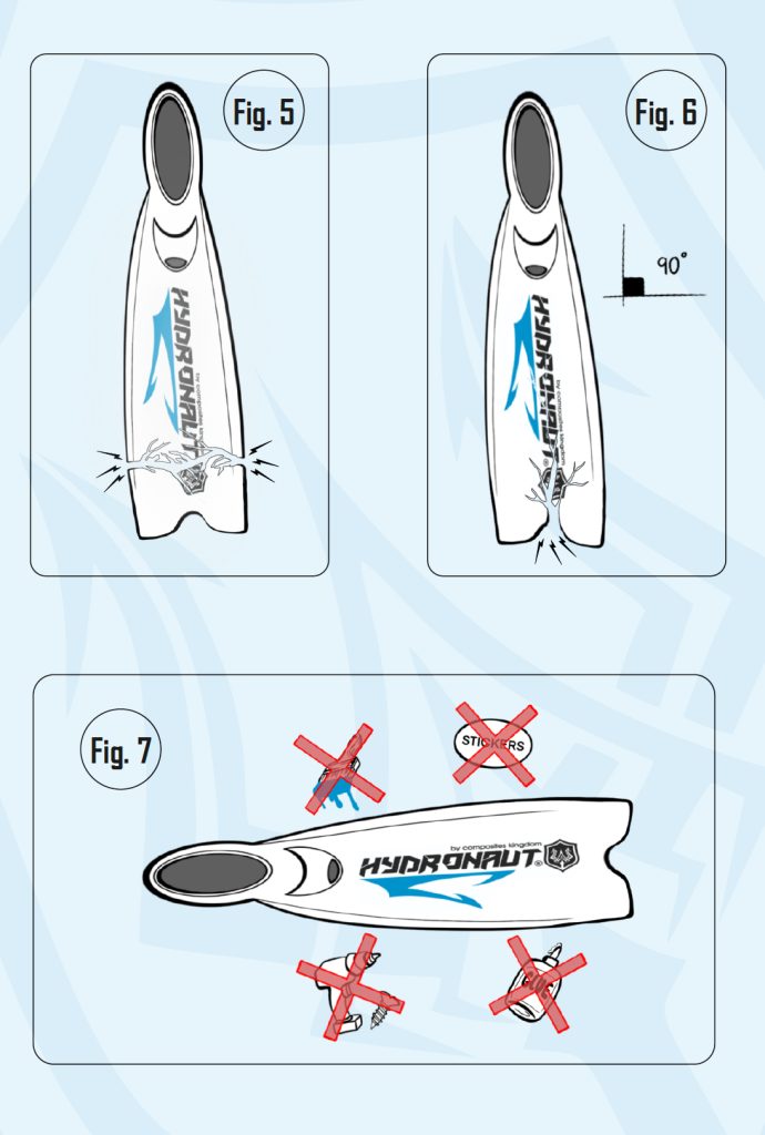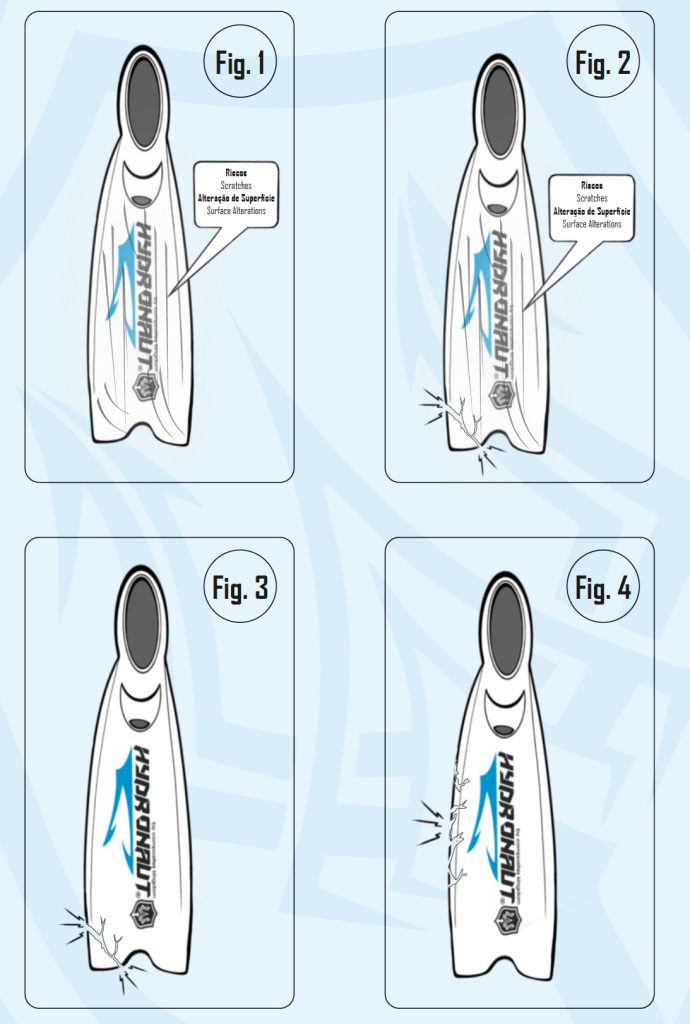7. Defeitos ou danos causados por sobrecarga estrutural, uso incomum ou incorreto em condições anormais / soprados, lágrimas, quedas, solavancos, flexão manual das lâminas ou mergulho da borda da piscina ou barco com as lâminas, etc. Estes NUNCA estão cobertos pela garantia (consulte o manual de usuário)